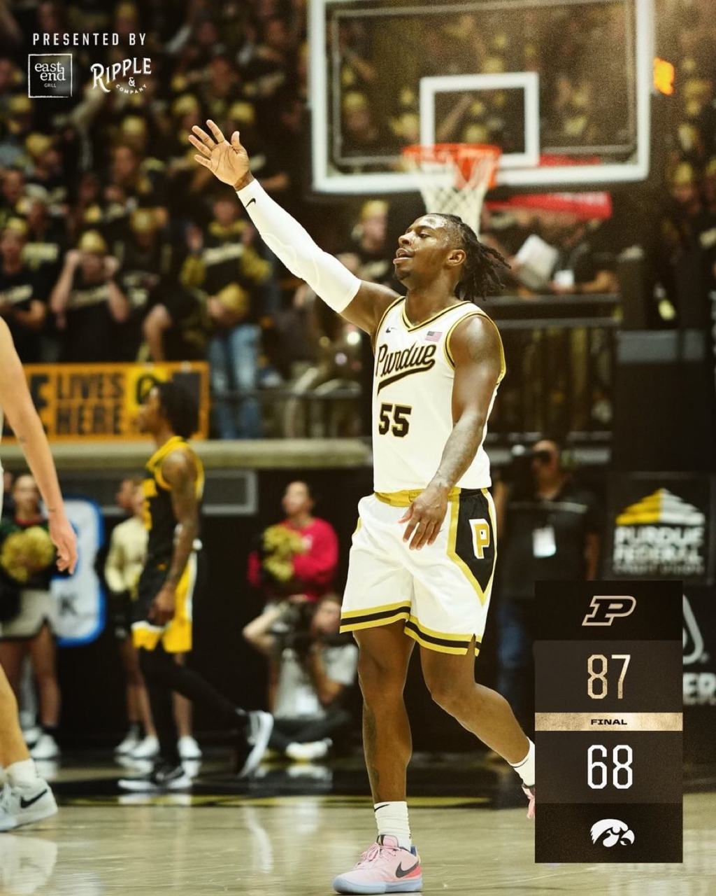 Purdue Basketball defeated the Iowa Hawkeyes by a final score of 87-68. Purdue’s leading scorers were Zach Edey with 25 points and 12 rebounds, Lance Jones with 17 points and 2 steals, and Fletcher Loyer with 12 points and 3 assists.