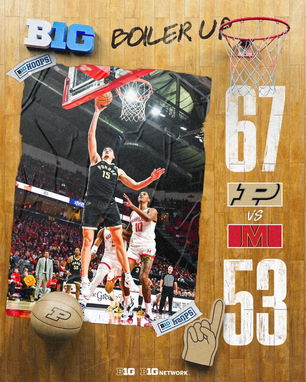 The Purdue Boilermakers defeated The Maryland Terrapins by a final score of 67-53. Purdue’s leading scorers were Zach Edey with 23 points and 12 rebounds, Braden Smith with 14 points, 6 assists, and 7 rebounds, and Lance Jones with 11 points and 4 assists.